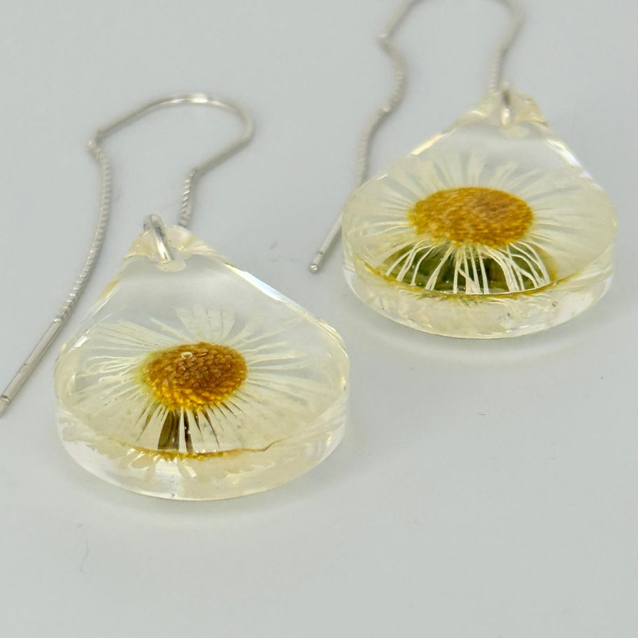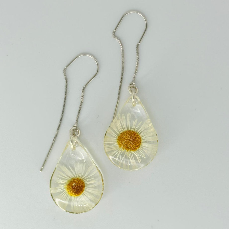 A delicate daisy preserved in epoxy resin, set on a sterling silver Box Chain Ear Thread with U-bar. This piece captures the purity and lightness of daisies, turning a simple bloom into a wearable symbol of joy and vitality.