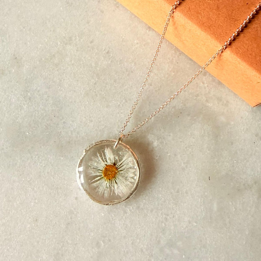 A miniature garden, preserved in sterling silver. Each pendant features a genuine daisy, hand-picked and meticulously dried by me before being cast in clear resin. The unique 925 sterling silver bail and frame are also handmade, intentionally sculpted with an organic texture to enhance the flower's raw beauty. This piece celebrates the imperfect perfection of nature and artisan craft, making every pendant truly one-of-a-kind.
